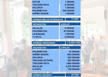 KLIKPOSITIF - Badan Penanggunalangan Bencana Daerah (BPBD) Kabupaten Agam mencatat pertanggal 1 Desember 2025 total korban meninggal dunia di kabupaten Agam mencapai 130 orang, dengan angka korban tertinggi di Kecamatan...